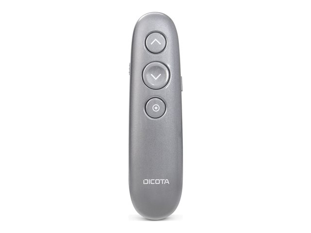 Description du produit DICOTA télécommande de présentation - gris Type de périphérique Télécommande de présentation Couleur du boîtier Gris Dimensions (LxPxH) 3.5 cm x 2.2 cm x 13 cm Poids 40 g Technologie sans fil 2.4 GHz Batterie Rechargeable Garantie du fabricant Garantie de 2 ans -