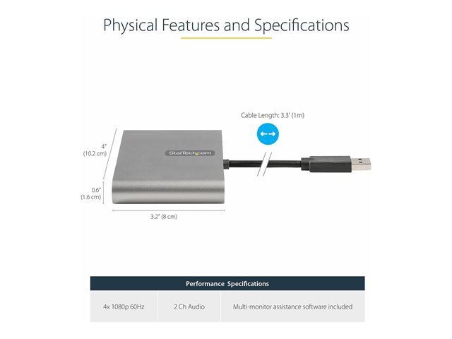 Carte Vidéo/Graphique Externe - Adaptateur USB Type-A vers Quadruple HDMI 1080p 60Hz - Convertisseur USB A vers HDMI - Windows Uniquement (USB32HD4) - Câble adaptateur - USB type A mâle pour HDMI femelle - 1 m - gris sidéral - support 1080 p 60 Hz