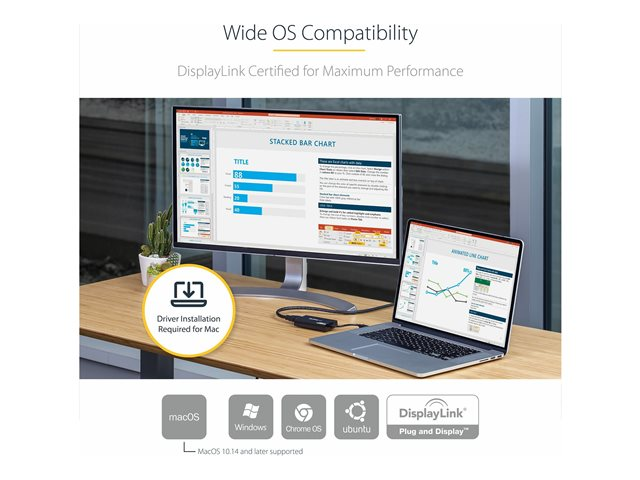 Utilisez cet adaptateur USB 3.0 vers HDMI pour connecter un écran, un vidéoprojecteur ou un téléviseur HDMI à votre ordinateur à l'aide d'un seul port USB Type-A.
