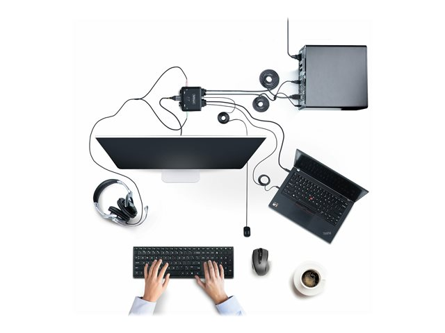 Ce commutateur KVM hybride permet aux utilisateurs de basculer entre un ordinateur de bureau compatible USB Type-A et HDMI et un ordinateur portable compatible USB Type-C (DP Alt-Mode), afin de partager un clavier, une souris, des périphériques d'entrée/sortie audio et un seul moniteur HDMI 4K 60 Hz.