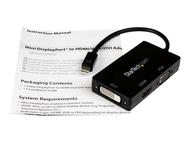 StarTech.com Adaptateur Mini DisplayPort 3 en 1 - 1080p - Répartiteur Mini DP / Thunderbolt vers HDMI / VGA / DVI pour Votre Moniteur (MDP2VGDVHD) - Adaptateur vidéo - Mini DisplayPort mâle pour HD-15 (VGA), DVI-D, HDMI femelle - 27 cm - noir - actif, support 1920 x 1200 (WUXGA) - pour P/N: DKT31CMDPHPD MDP2VGDVHD