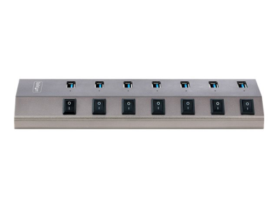 Ce hub USB 3.2 Gen 1 (5Gbps) à 7 ports ajoute sept ports USB de type A à un ordinateur, avec l'avantage supplémentaire que chaque port dispose d'un interrupteur marche/arrêt individuel. Le hub USB est auto-alimenté par l'adaptateur d'alimentation fourni. Il se connecte à un port USB-A, ou USB-C sur un ordinateur portable ou de bureau.